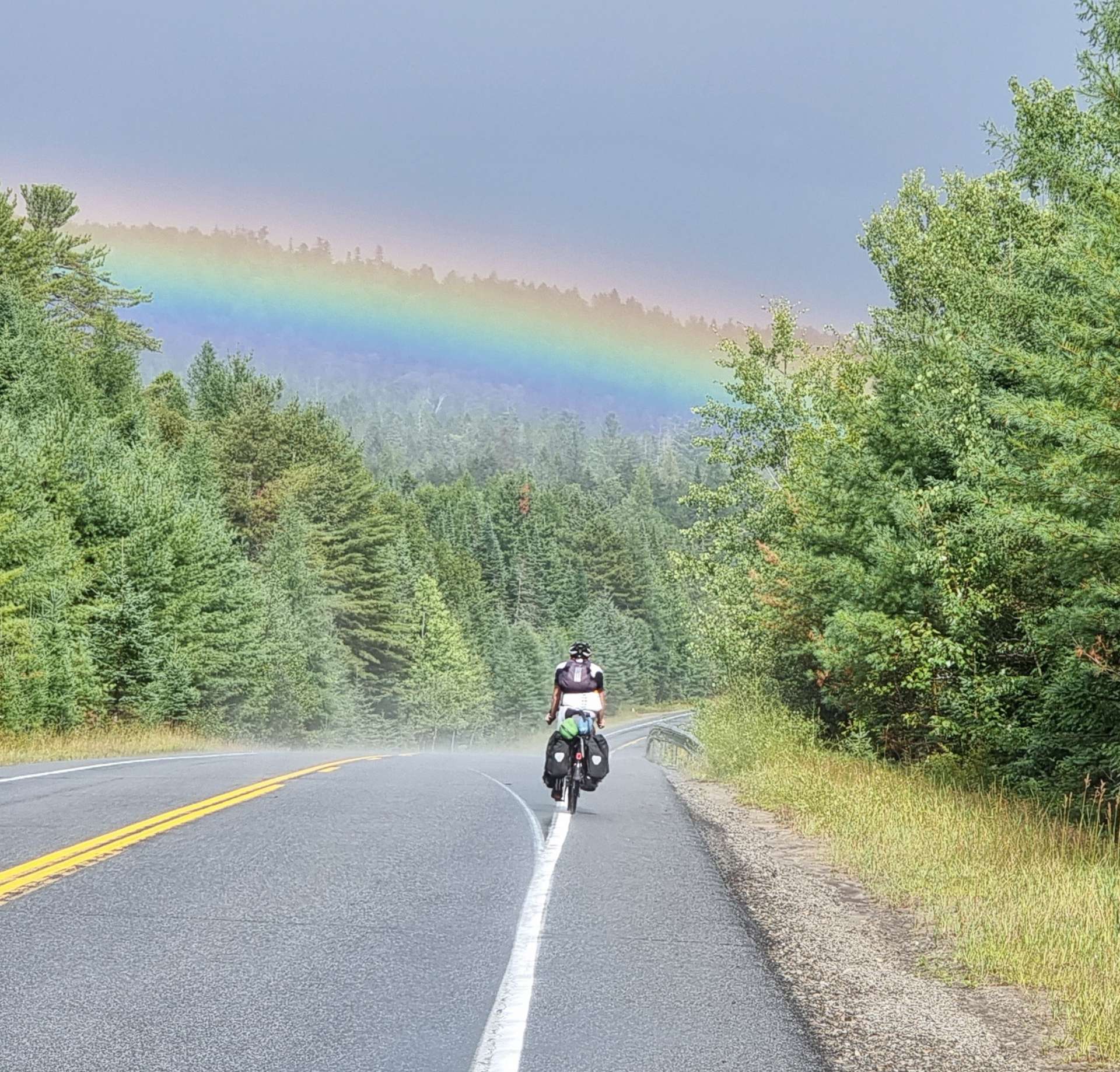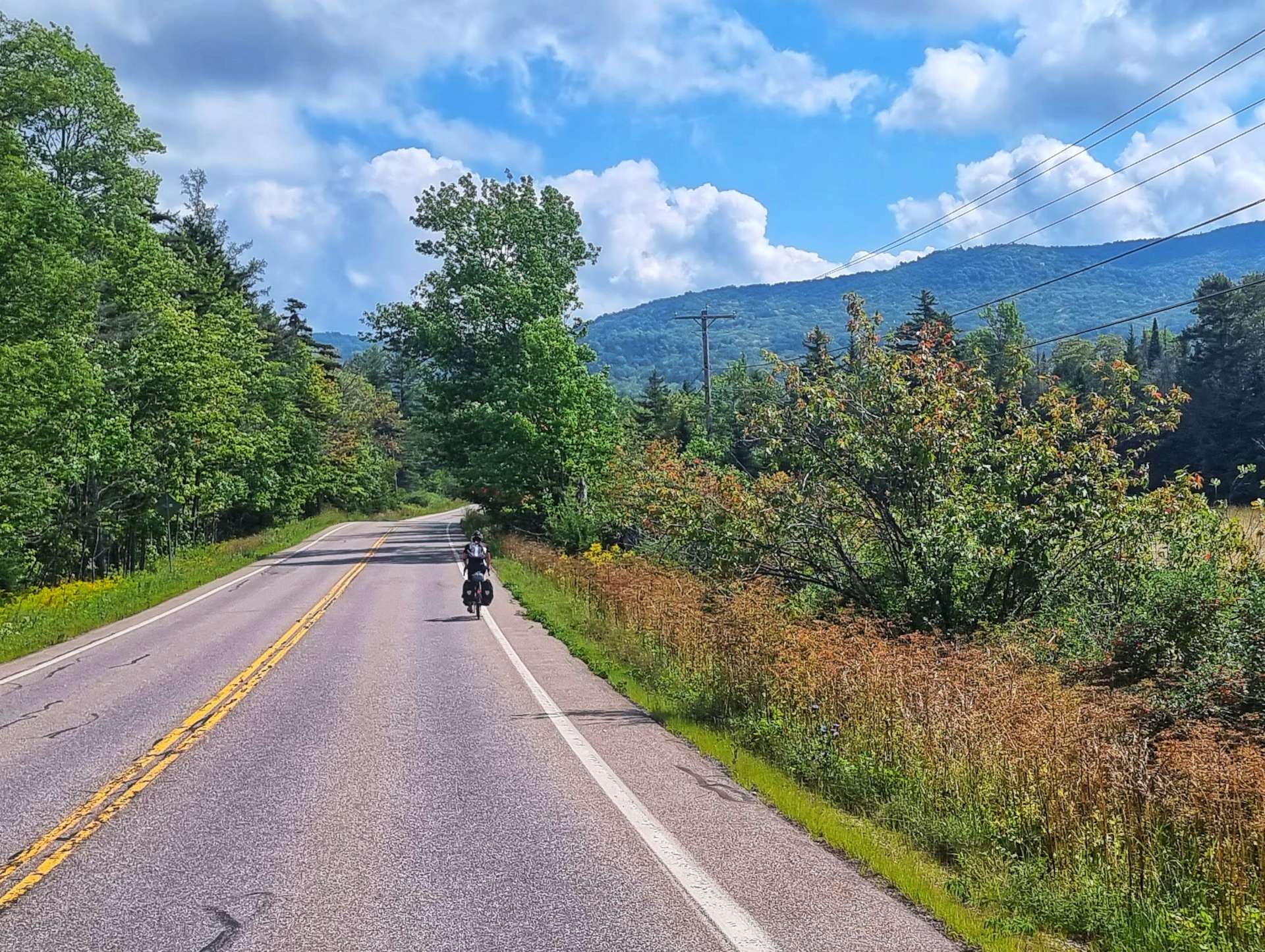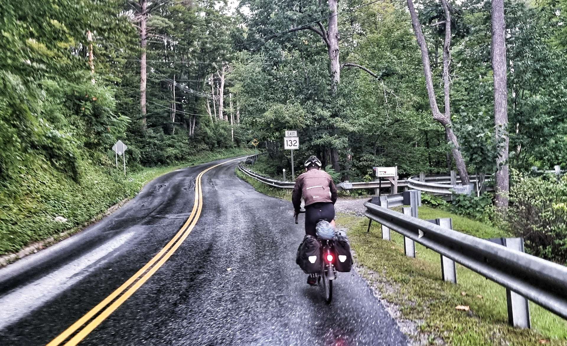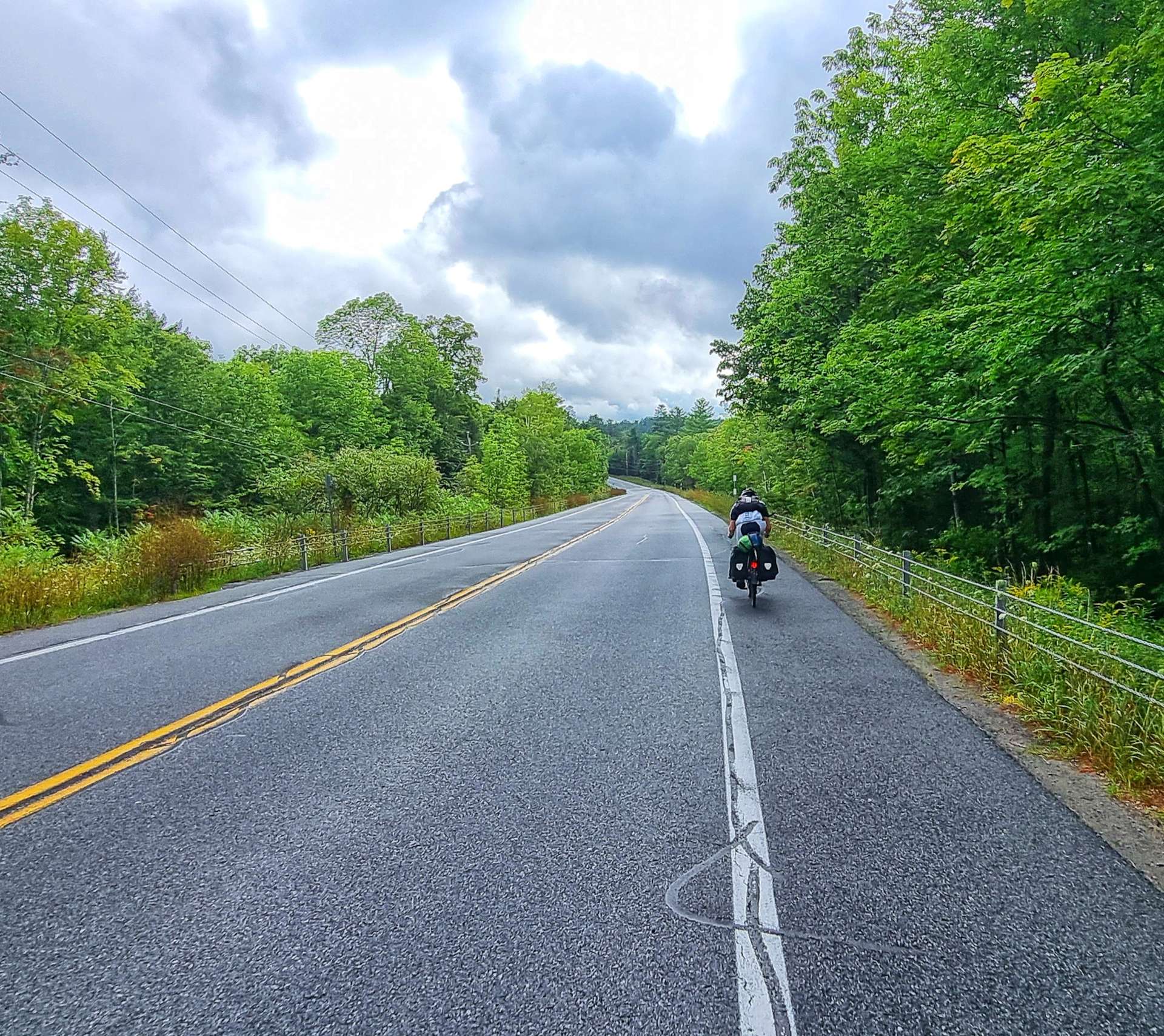 We were back on the road by 3pm, with about 45 miles still to ride. The weather was still unsettled, but we set off in the dry & kept our fingers crossed that it might stay that way. We started climbing the side of the Hudson River valley along Blue Ridge Road & rode through verdant, green forest up to the summit. Our enforced delay resulted in us arriving just in time to see a rainbow further up the road.