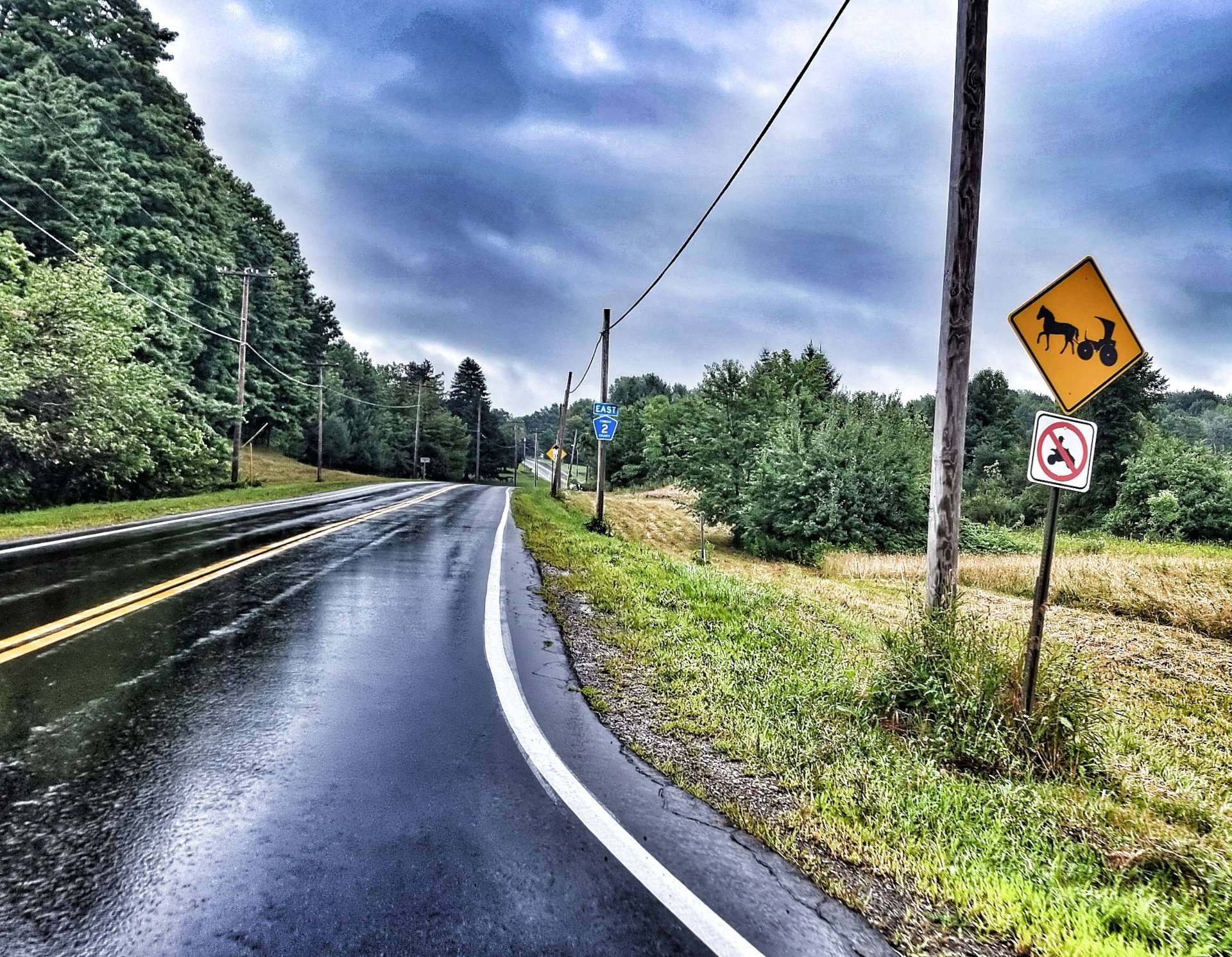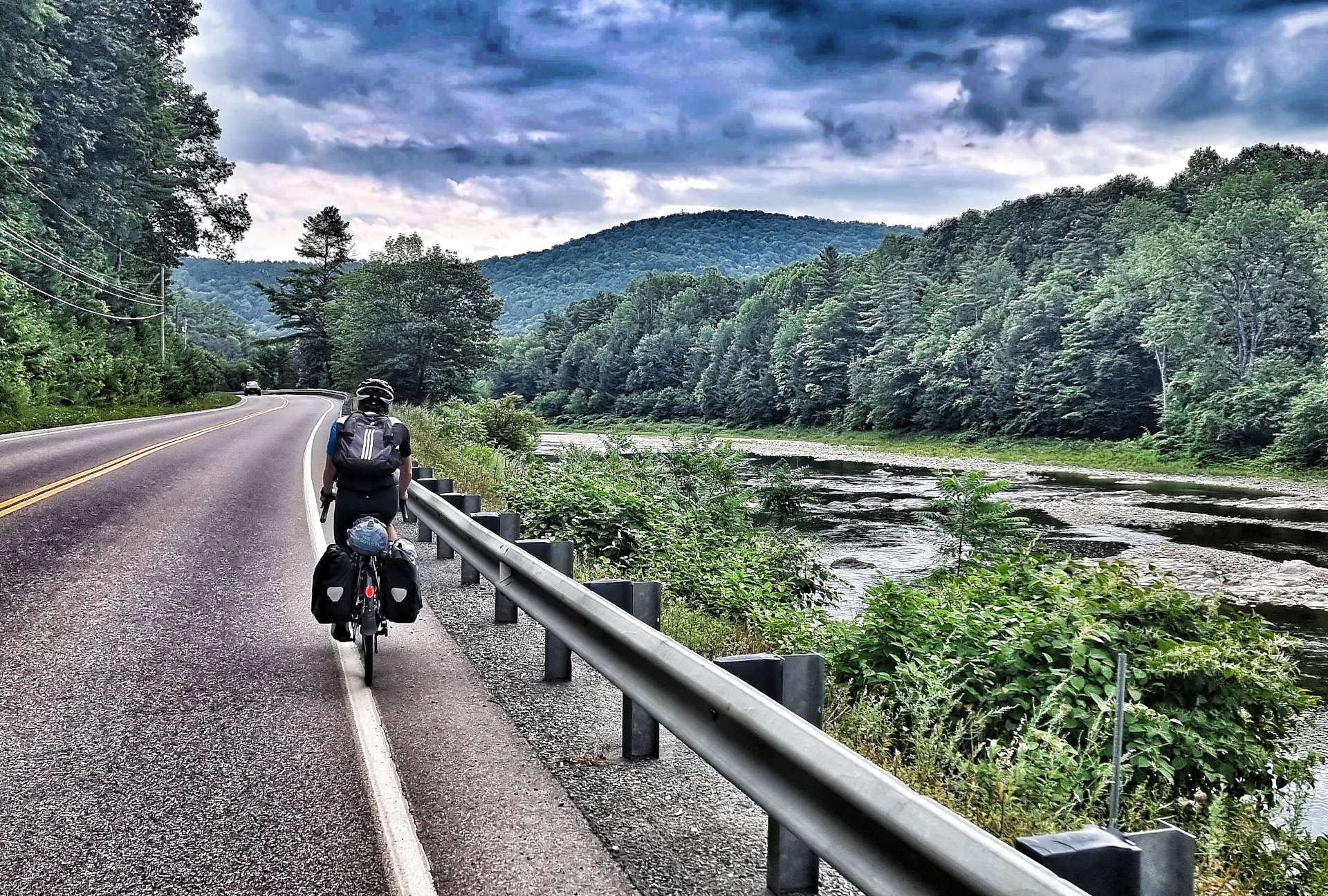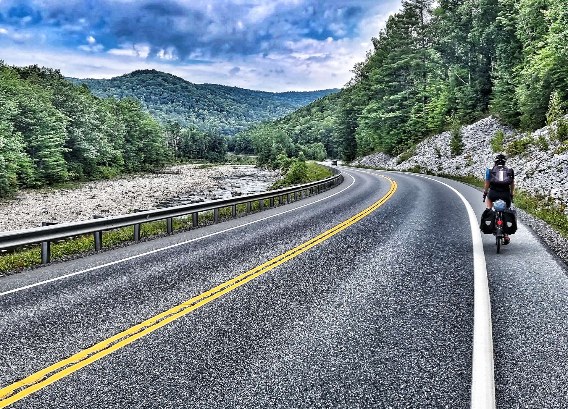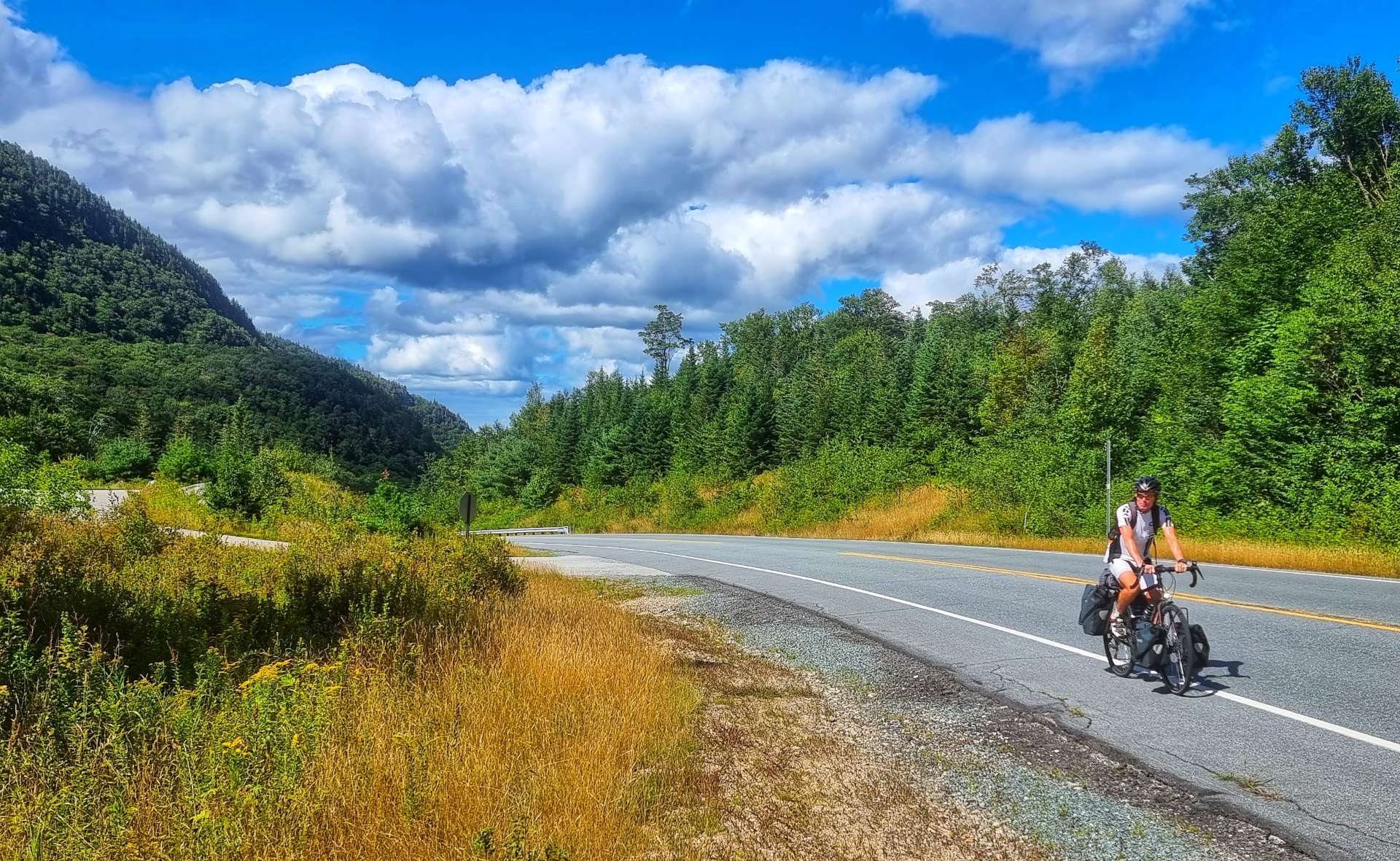 We were back on the road by 3pm, with about 45 miles still to ride. The weather was still unsettled, but we set off in the dry & kept our fingers crossed that it might stay that way. We started climbing the side of the Hudson River valley along Blue Ridge Road & rode through verdant, green forest up to the summit. Our enforced delay resulted in us arriving just in time to see a rainbow further up the road.