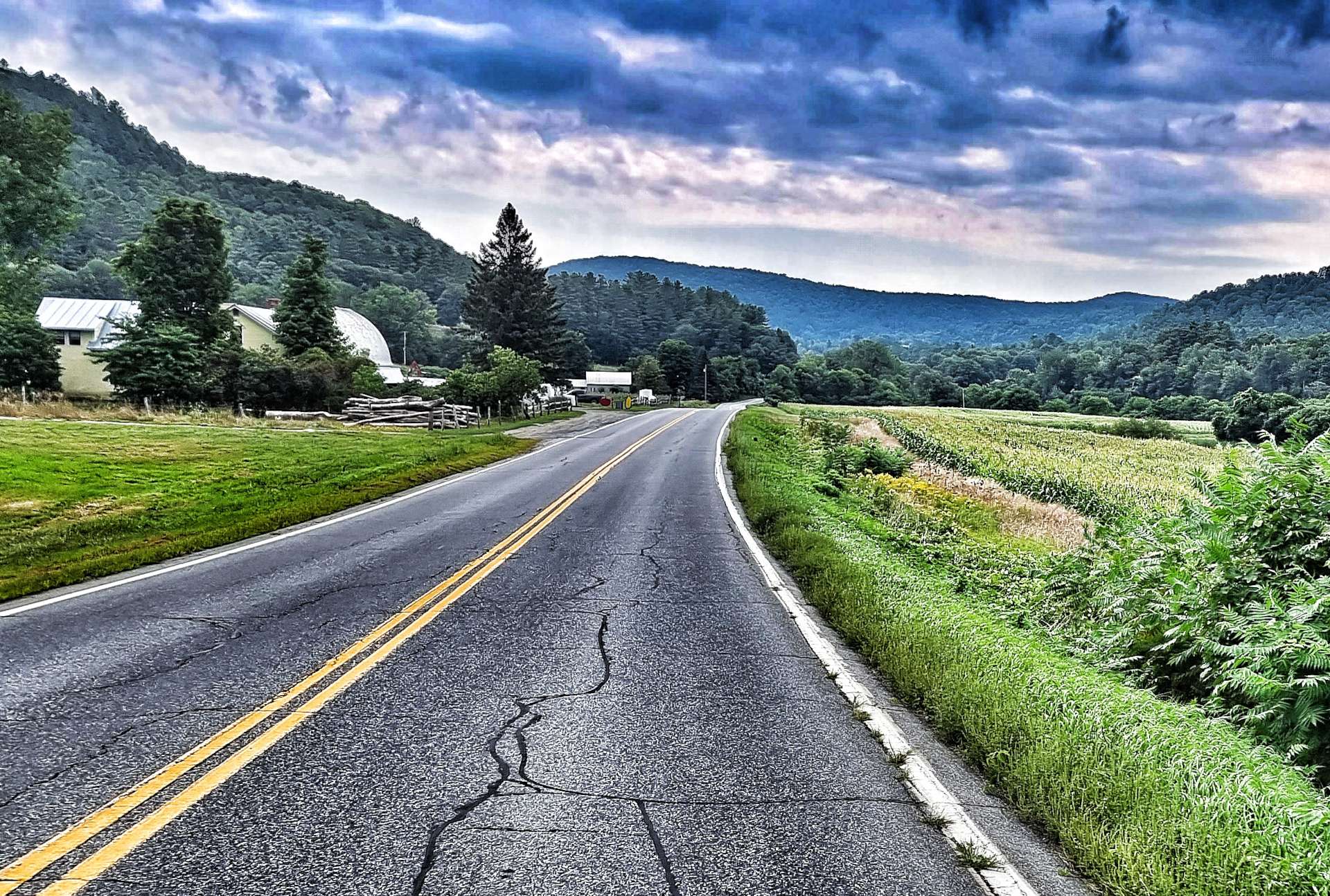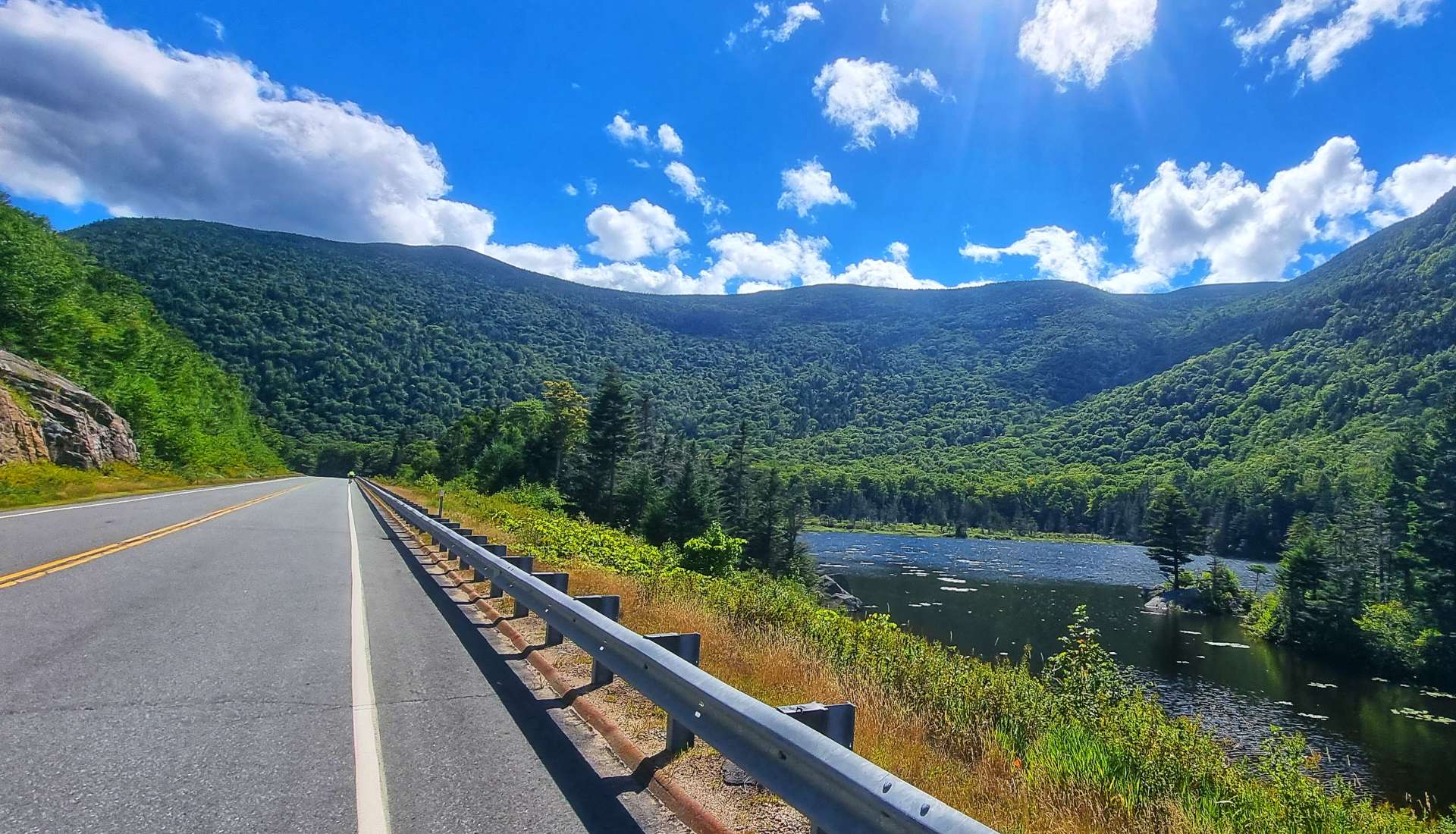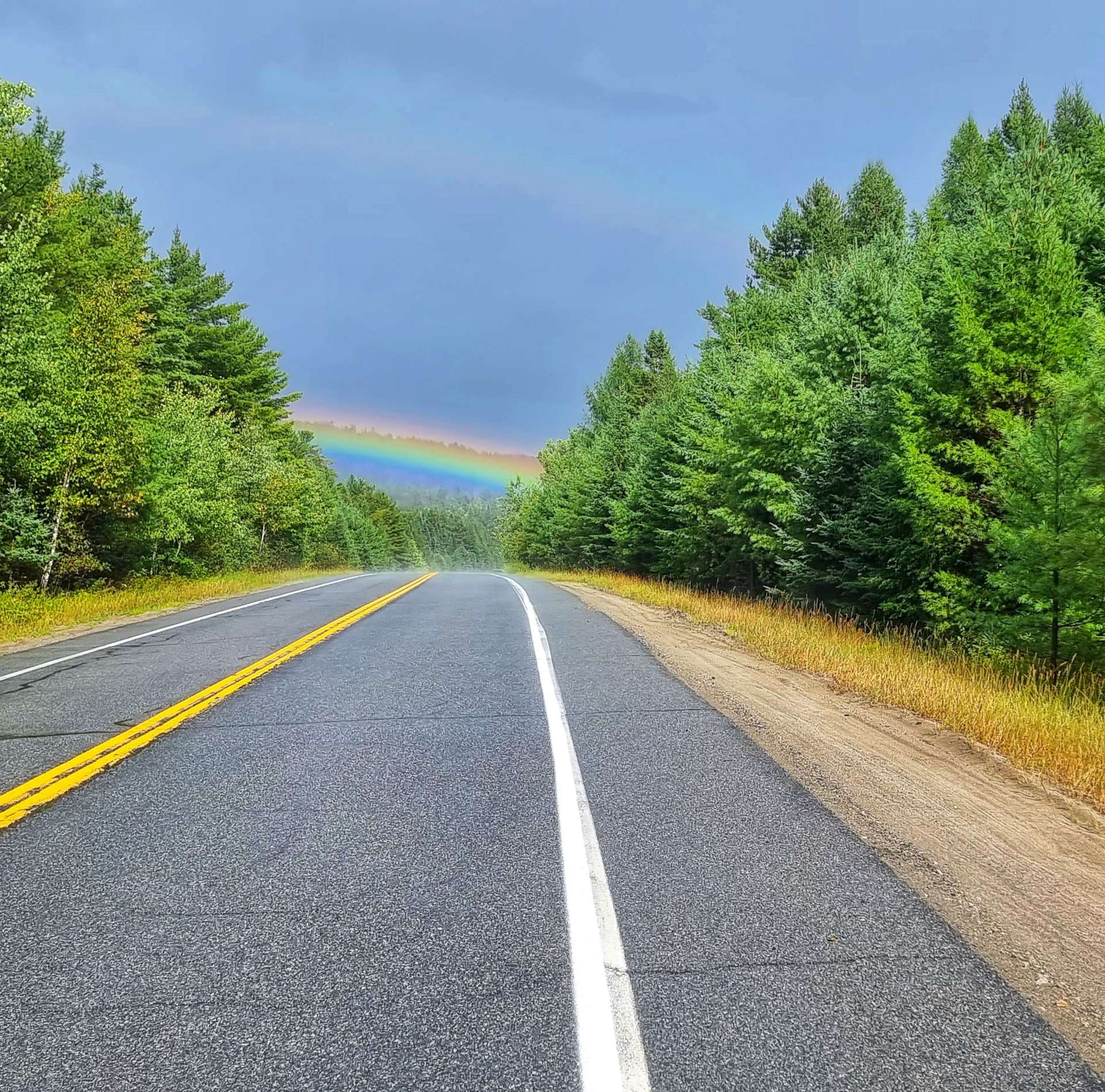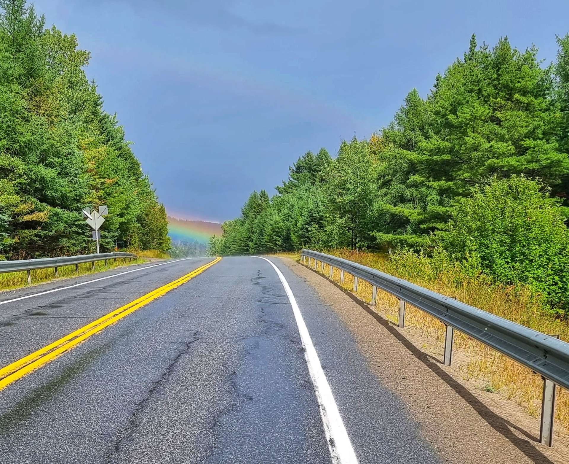 We were back on the road by 3pm, with about 45 miles still to ride. The weather was still unsettled, but we set off in the dry & kept our fingers crossed that it might stay that way. We started climbing the side of the Hudson River valley along Blue Ridge Road & rode through verdant, green forest up to the summit. Our enforced delay resulted in us arriving just in time to see a rainbow further up the road.