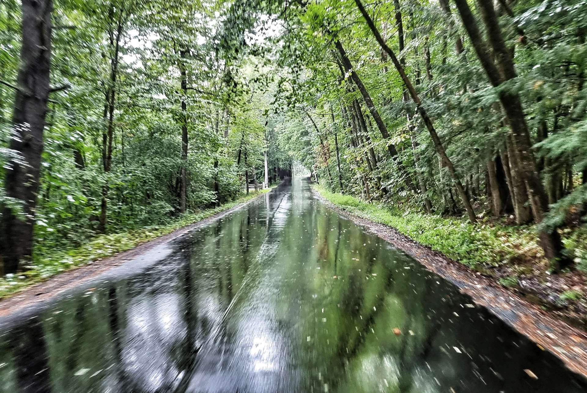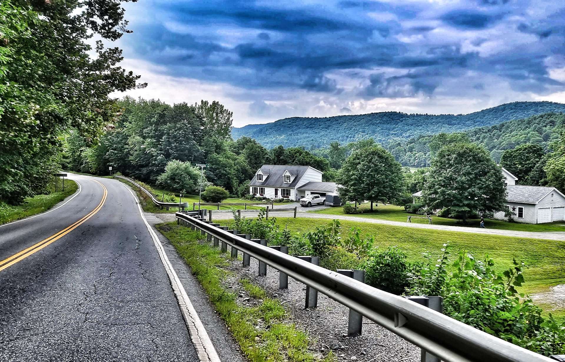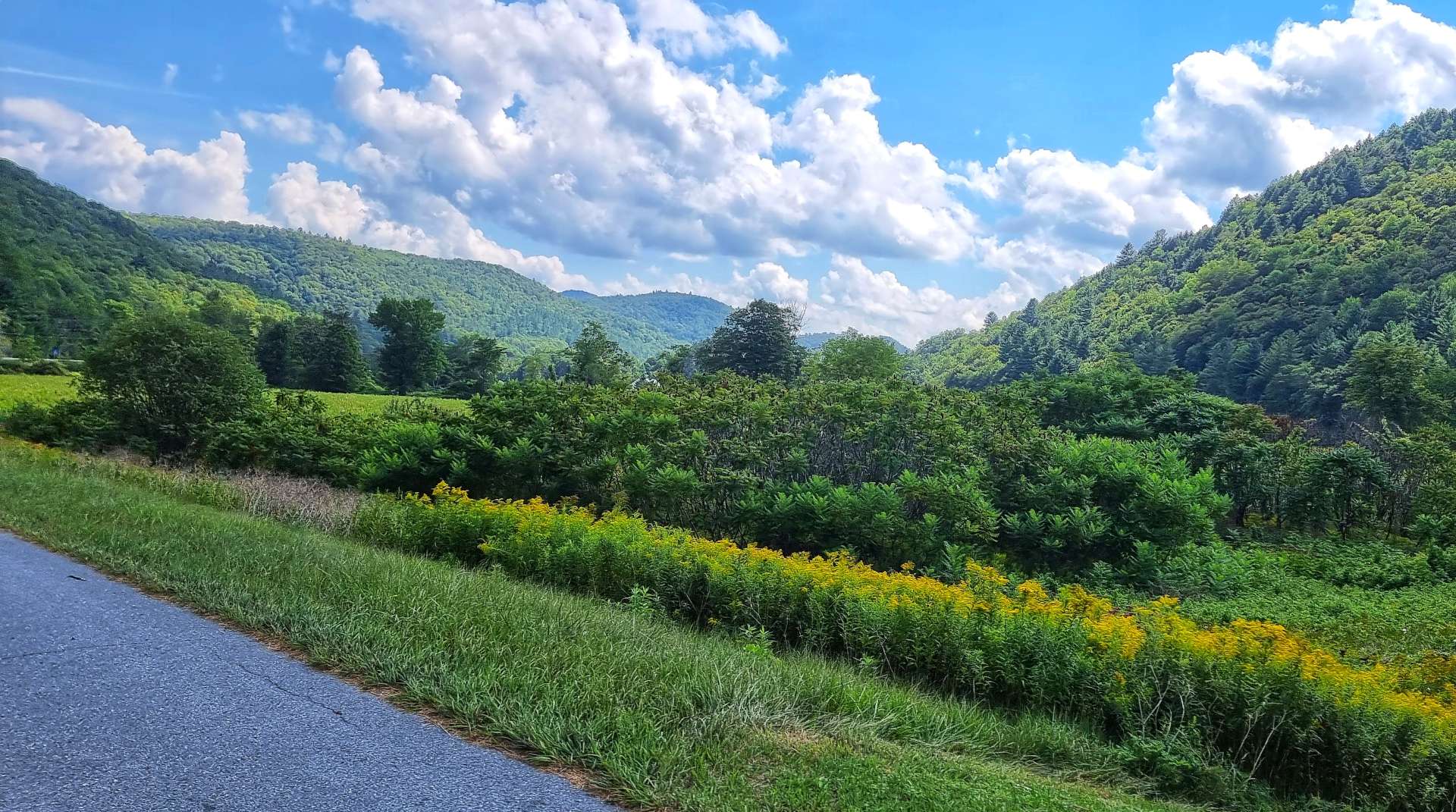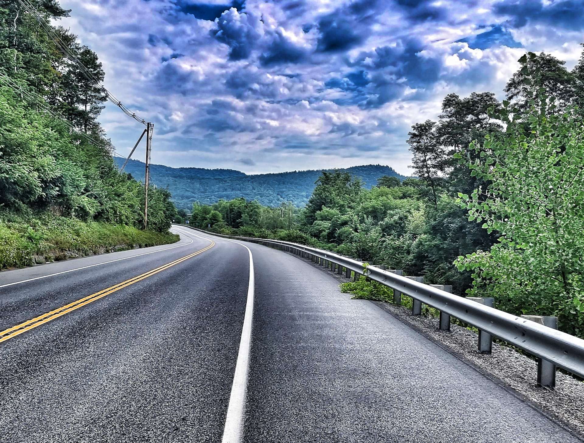 We were back on the road by 3pm, with about 45 miles still to ride. The weather was still unsettled, but we set off in the dry & kept our fingers crossed that it might stay that way. We started climbing the side of the Hudson River valley along Blue Ridge Road & rode through verdant, green forest up to the summit. Our enforced delay resulted in us arriving just in time to see a rainbow further up the road.