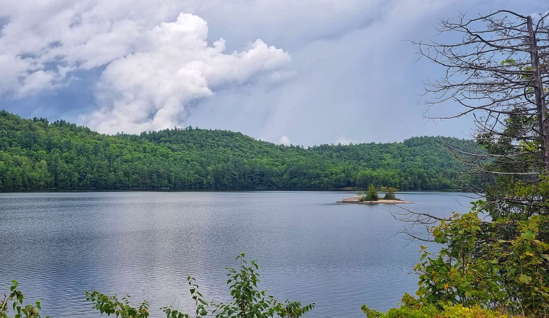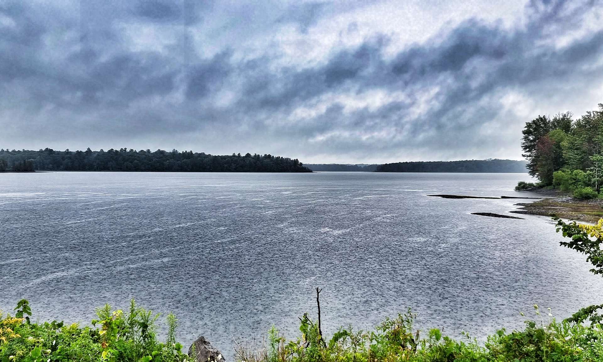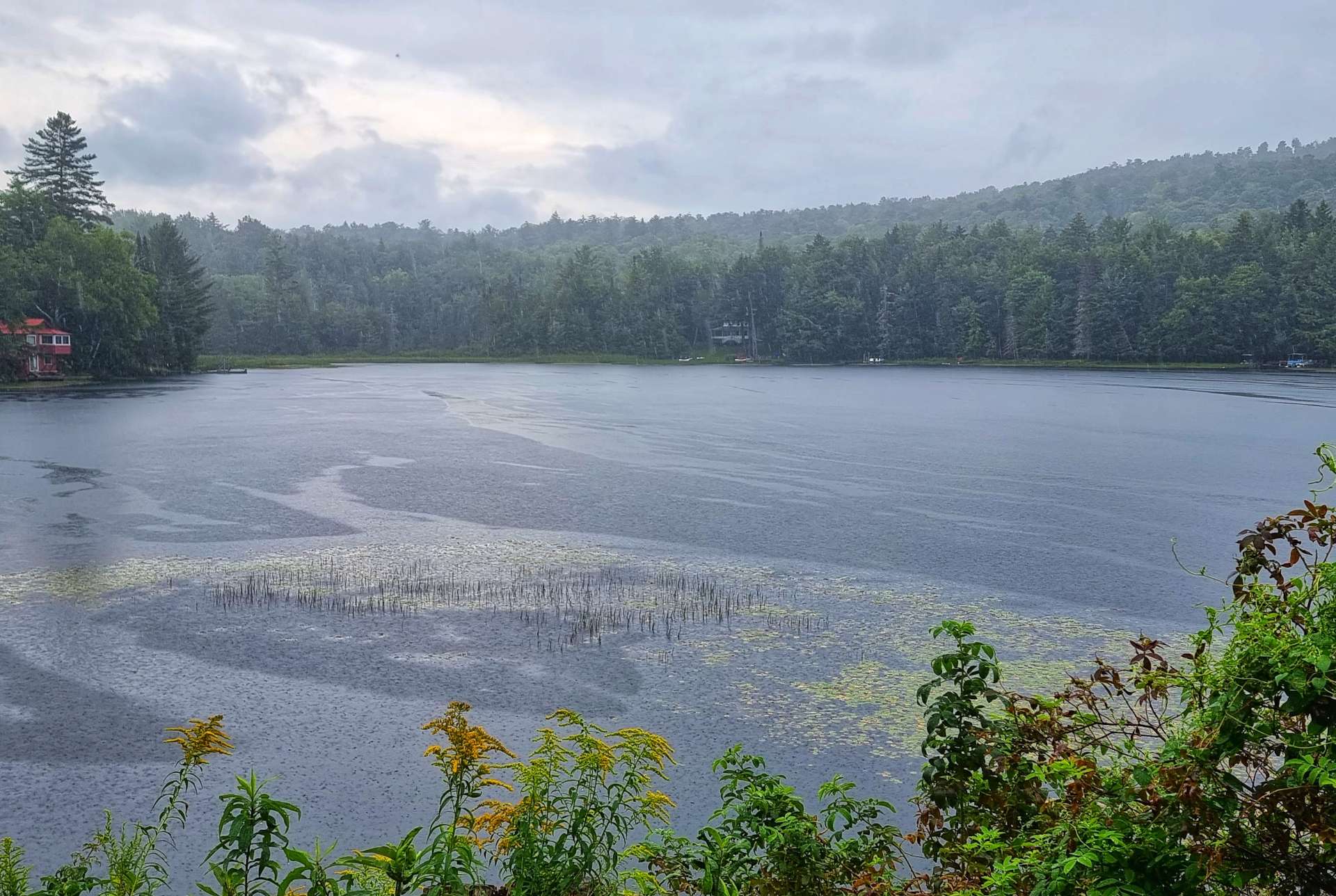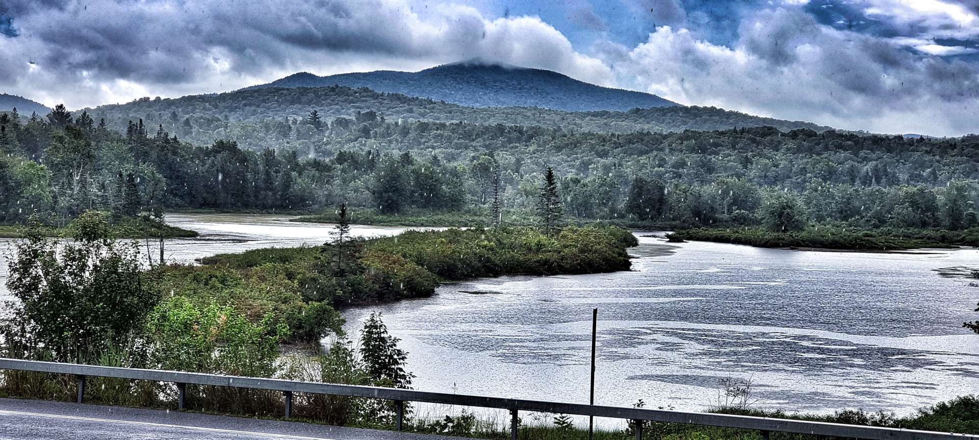 We left Long Lake under brooding, grey skies & a gap in the early morning rain. However, within 10 minutes the skies had opened again, just as we summitted a small climb with a view over Shaw Pond. A lone heron was fishing for its breakfast, but it looked a very sorry figure with the rain falling like stair-rods.