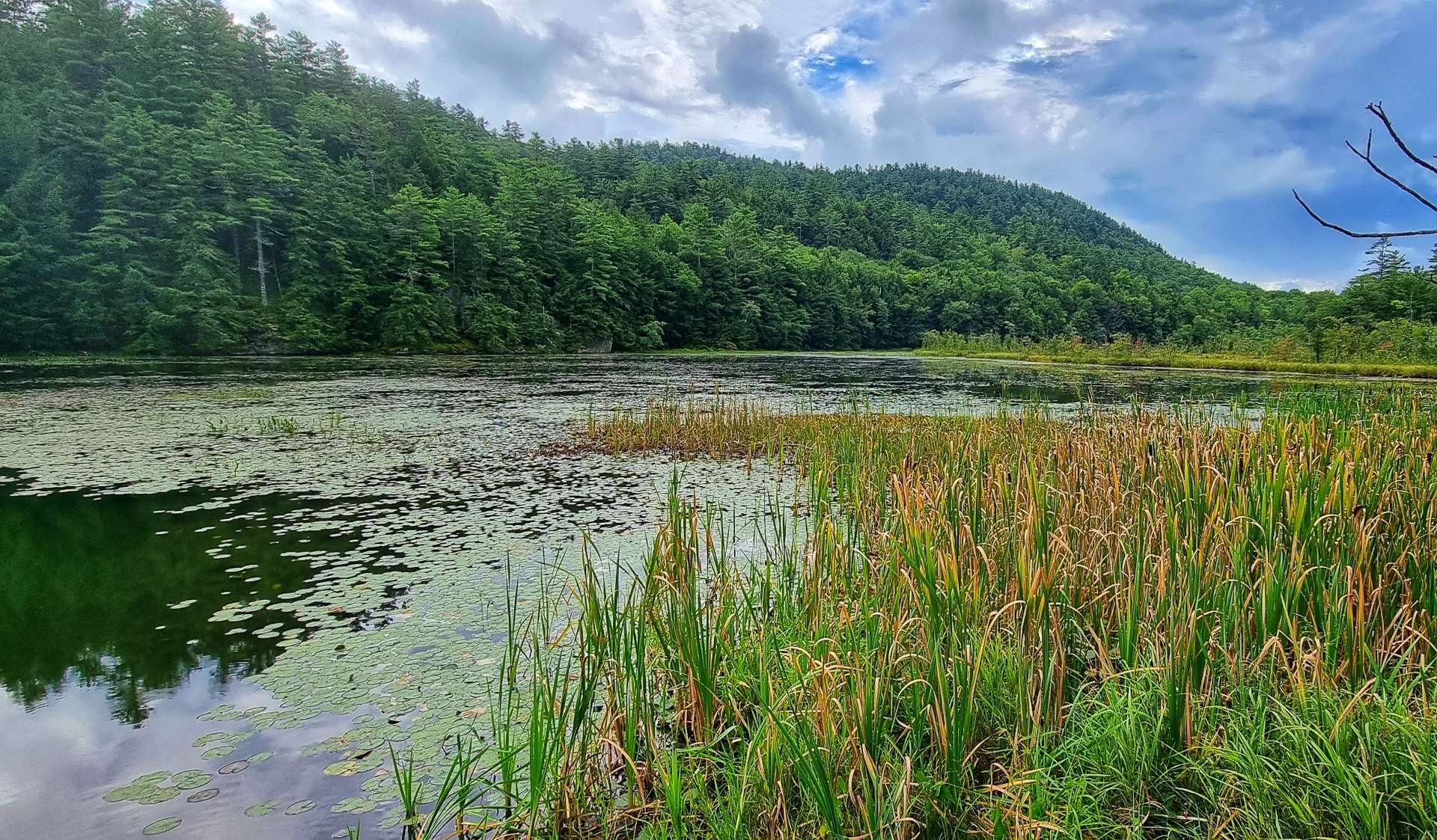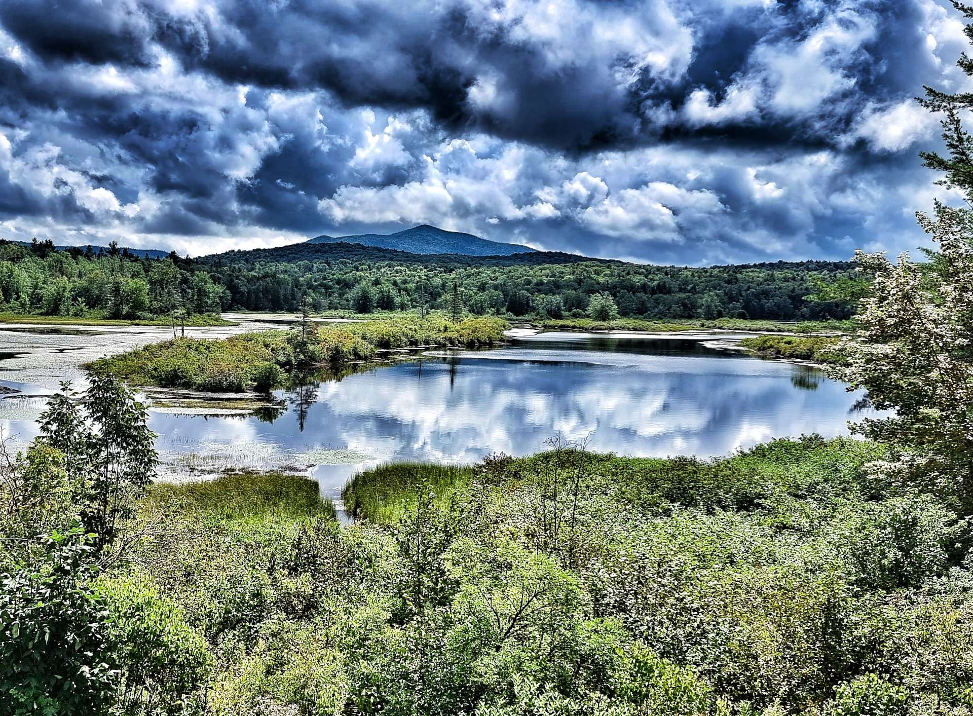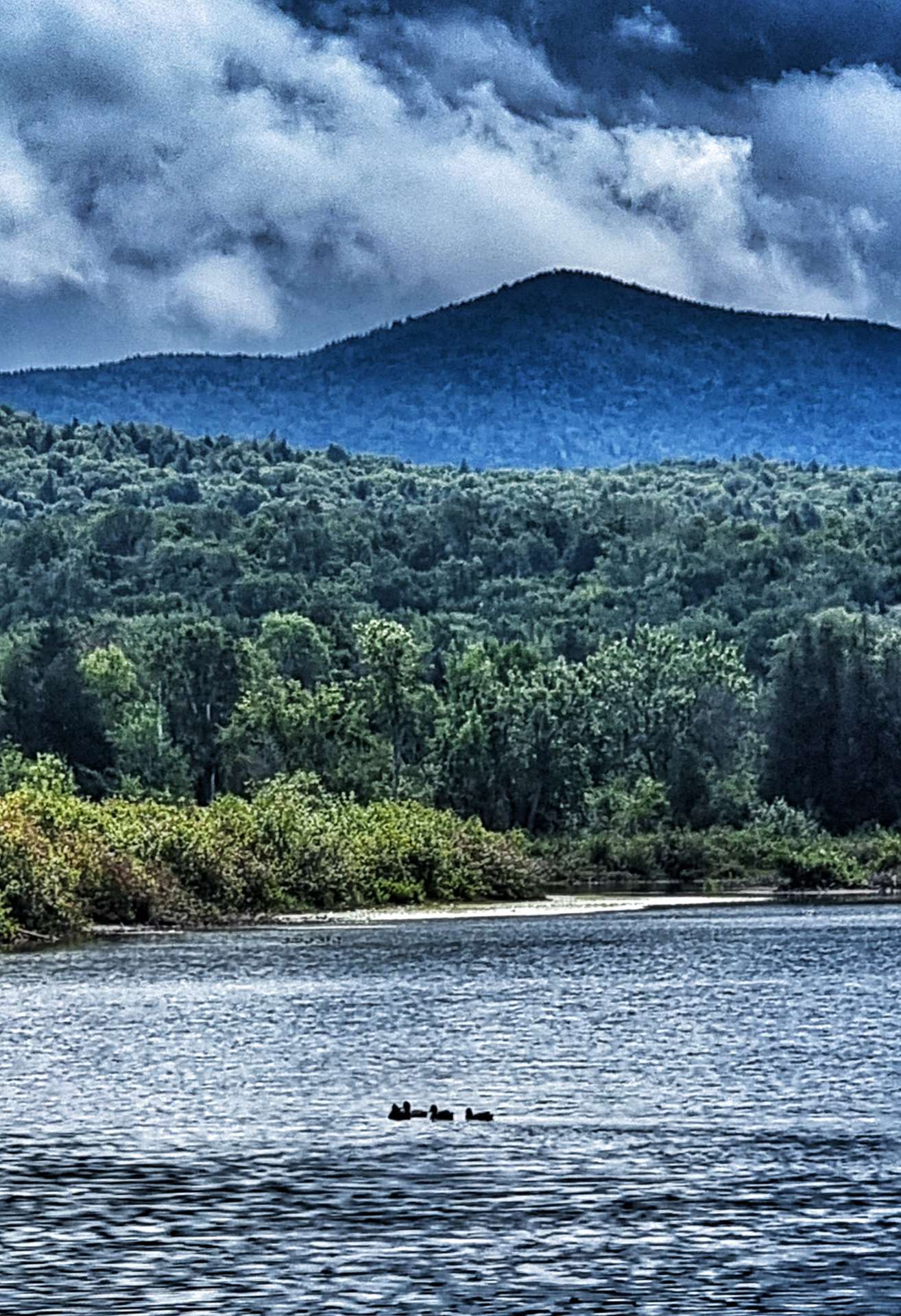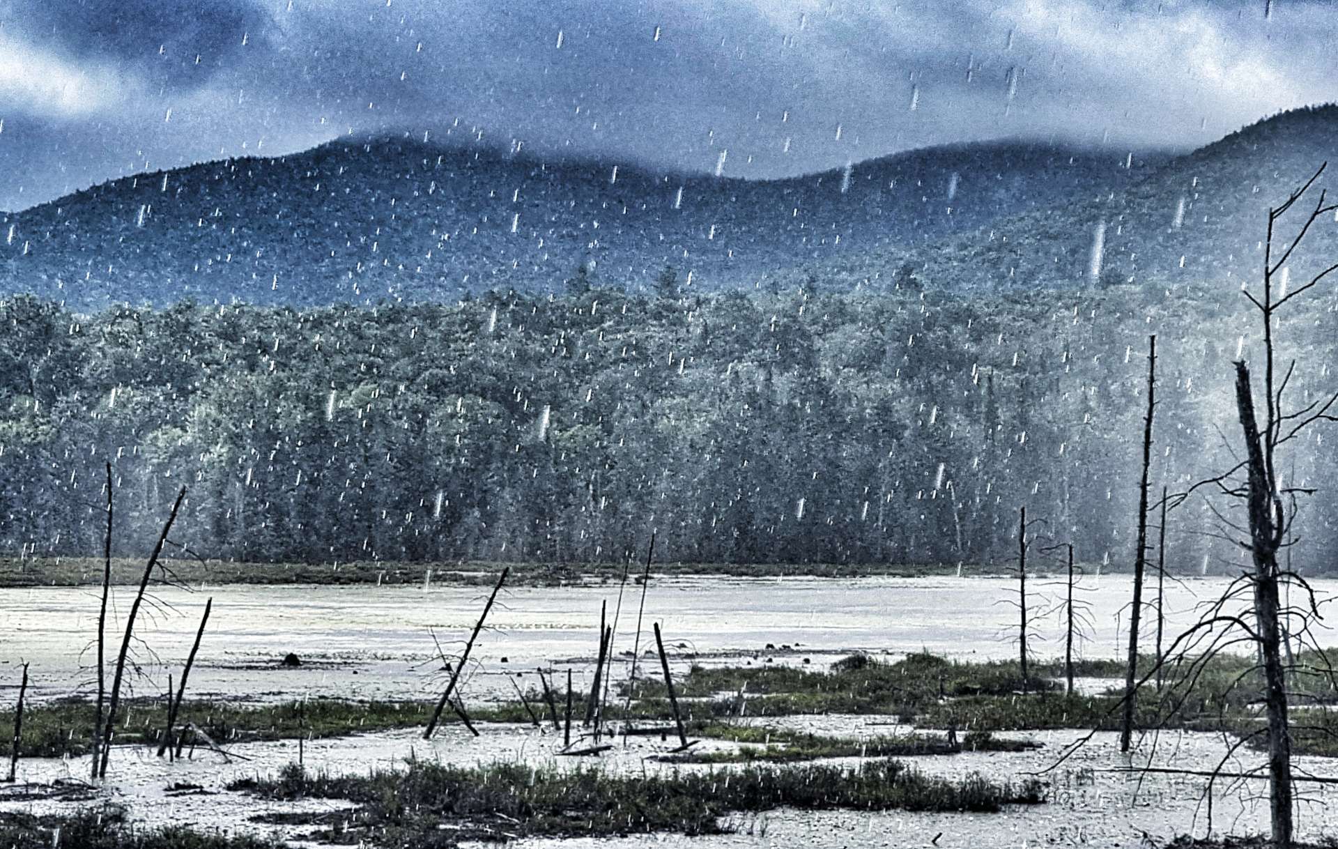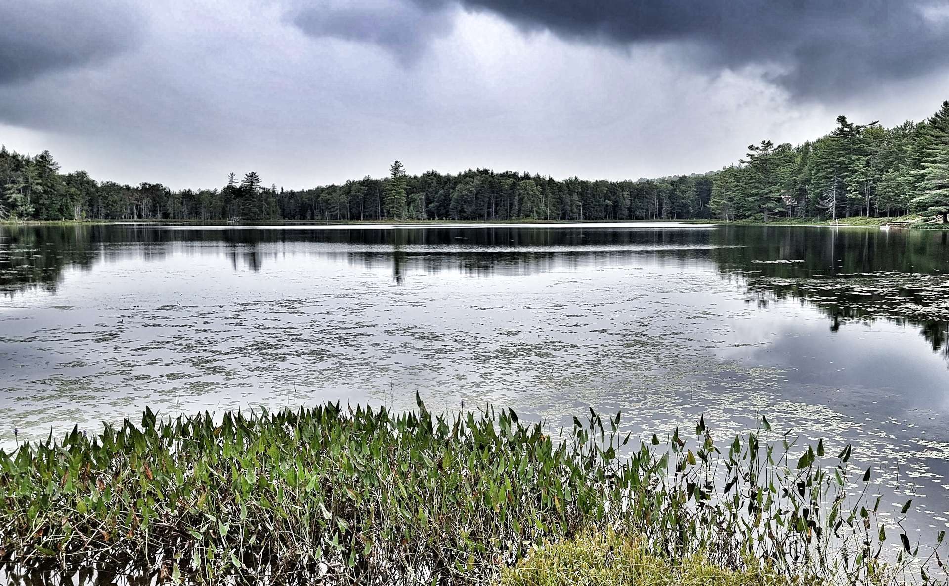 We left Long Lake under brooding, grey skies & a gap in the early morning rain. However, within 10 minutes the skies had opened again, just as we summitted a small climb with a view over Shaw Pond. A lone heron was fishing for its breakfast, but it looked a very sorry figure with the rain falling like stair-rods.