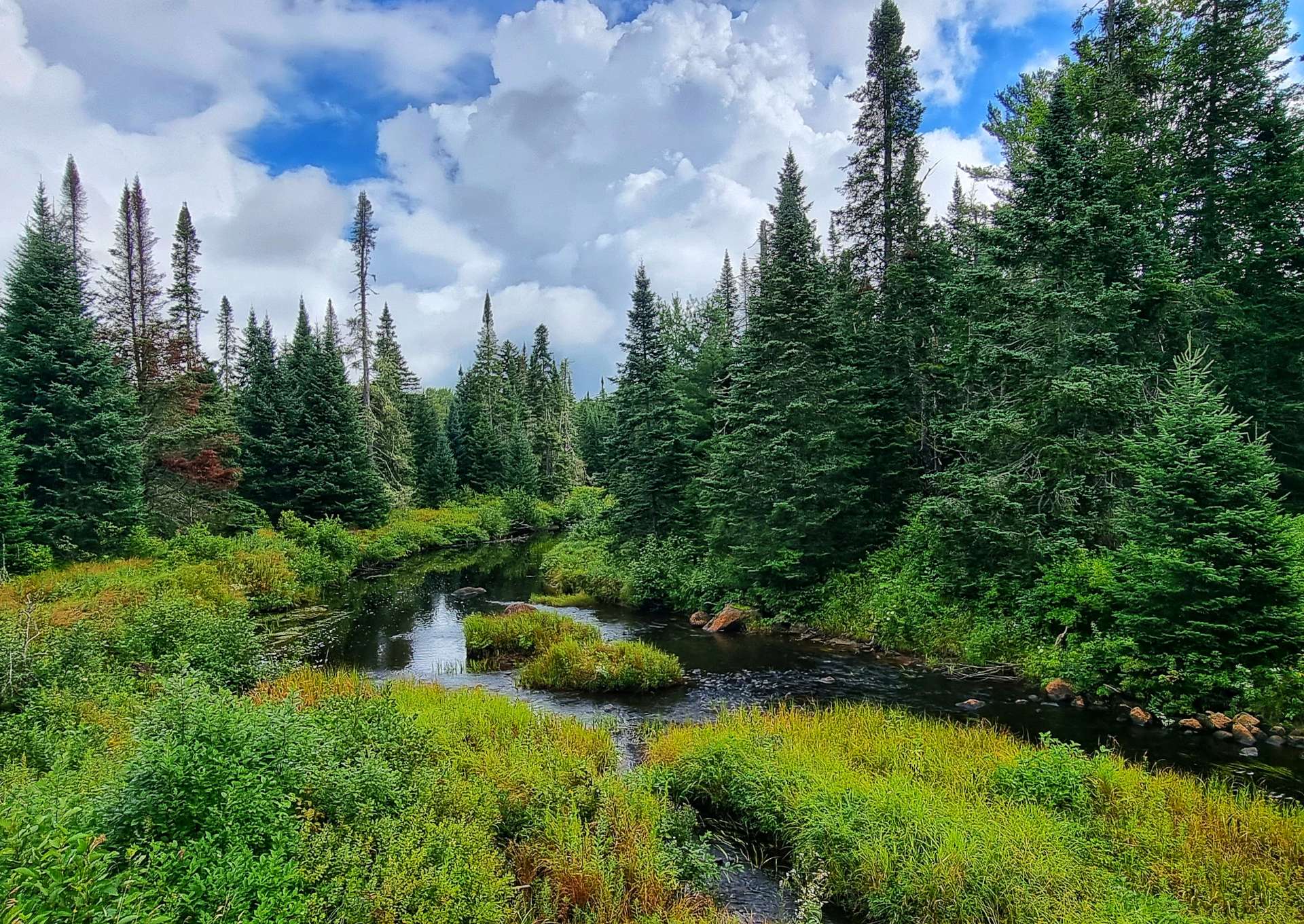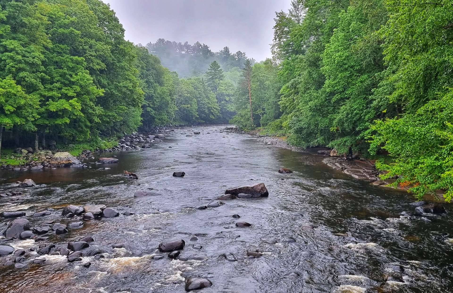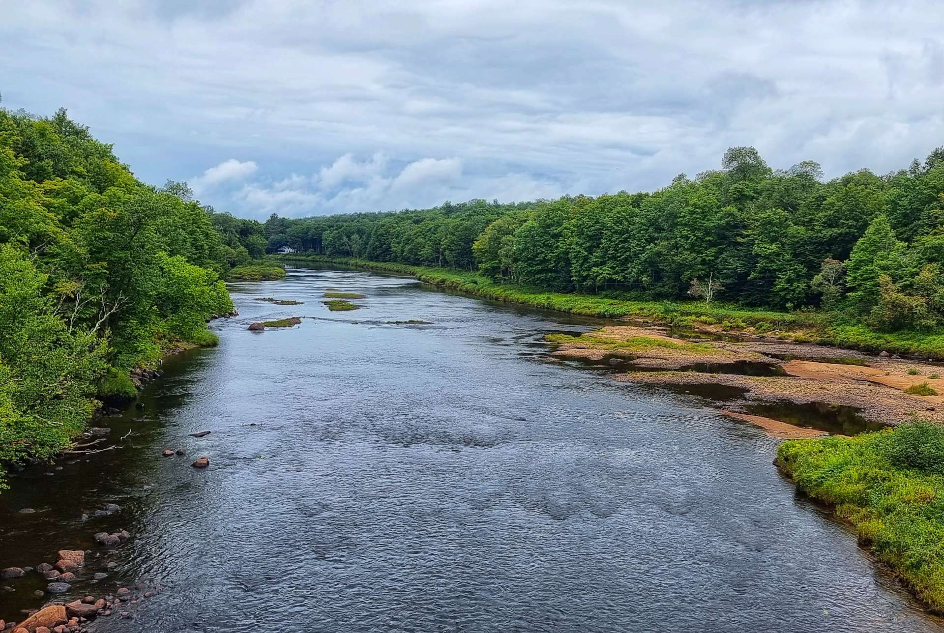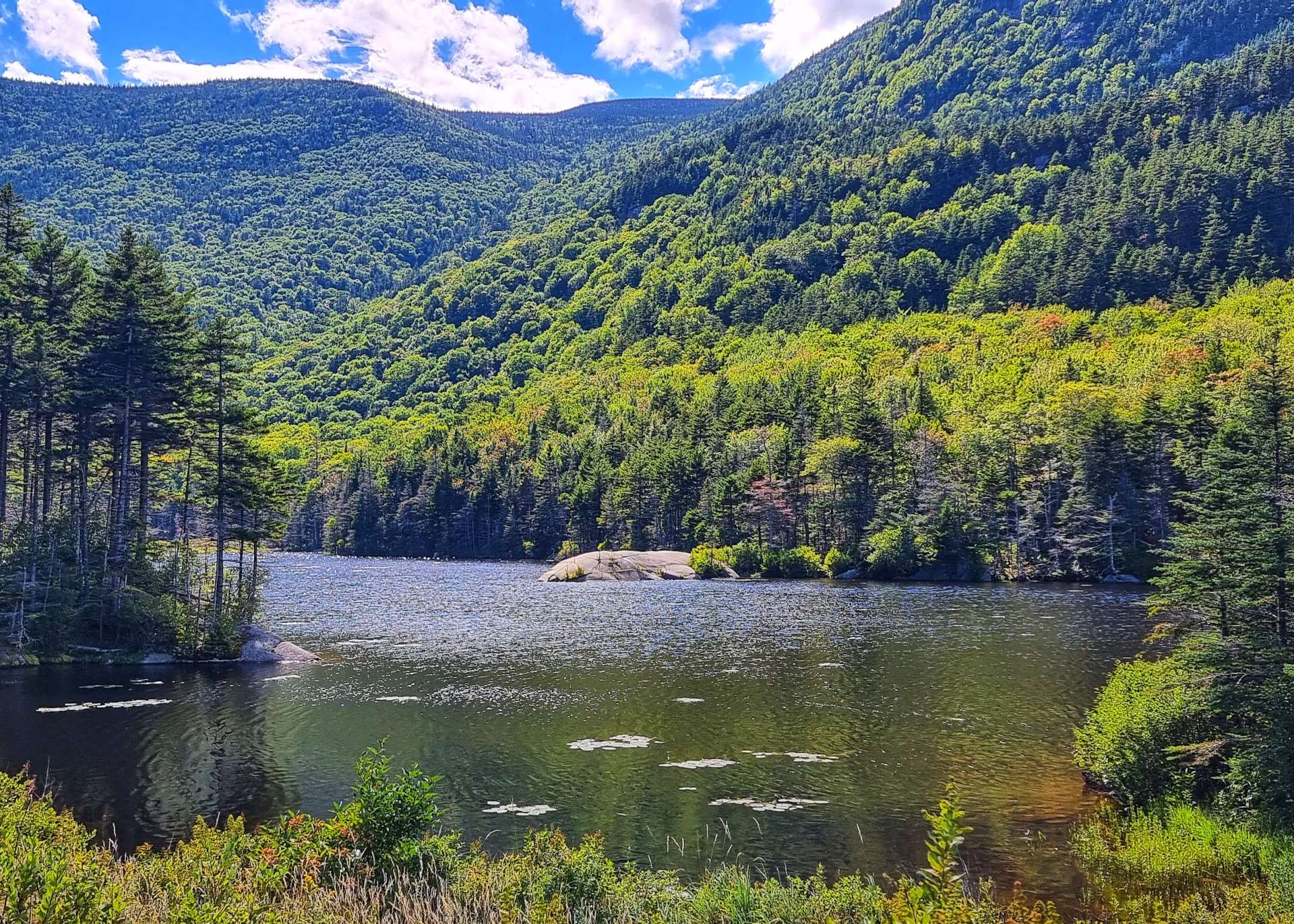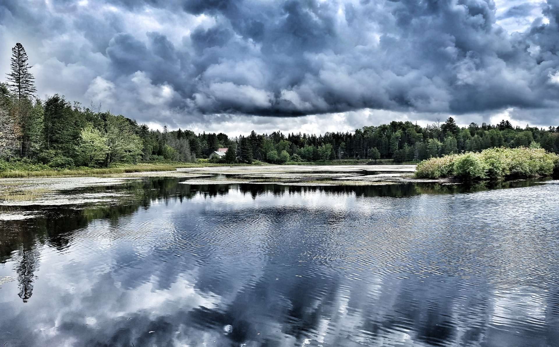 We left Long Lake under brooding, grey skies & a gap in the early morning rain. However, within 10 minutes the skies had opened again, just as we summitted a small climb with a view over Shaw Pond. A lone heron was fishing for its breakfast, but it looked a very sorry figure with the rain falling like stair-rods.