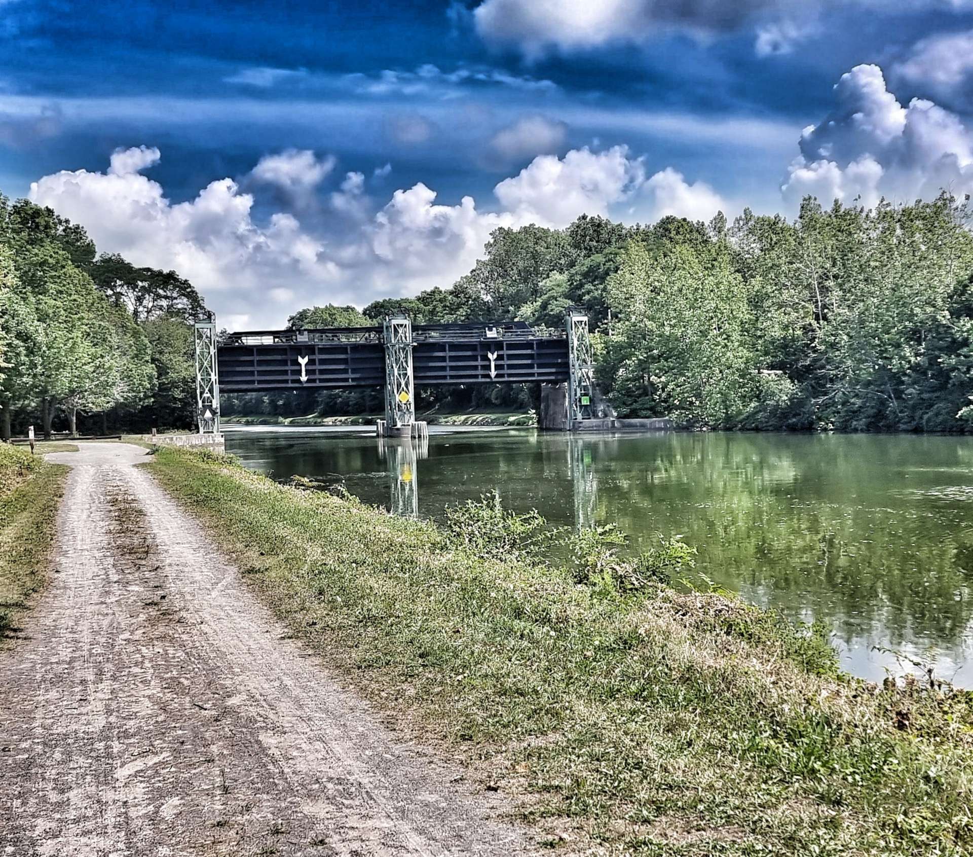 Today, the canal is 120 to 200 feet wide by 12 to 23 feet deep & it has 57 locks, each of which are 310 feet long. As we made our way past Adams Basin & Spencerport the variations in width were obvious to the naked eye. The bridges were always located at narrow crossing points.