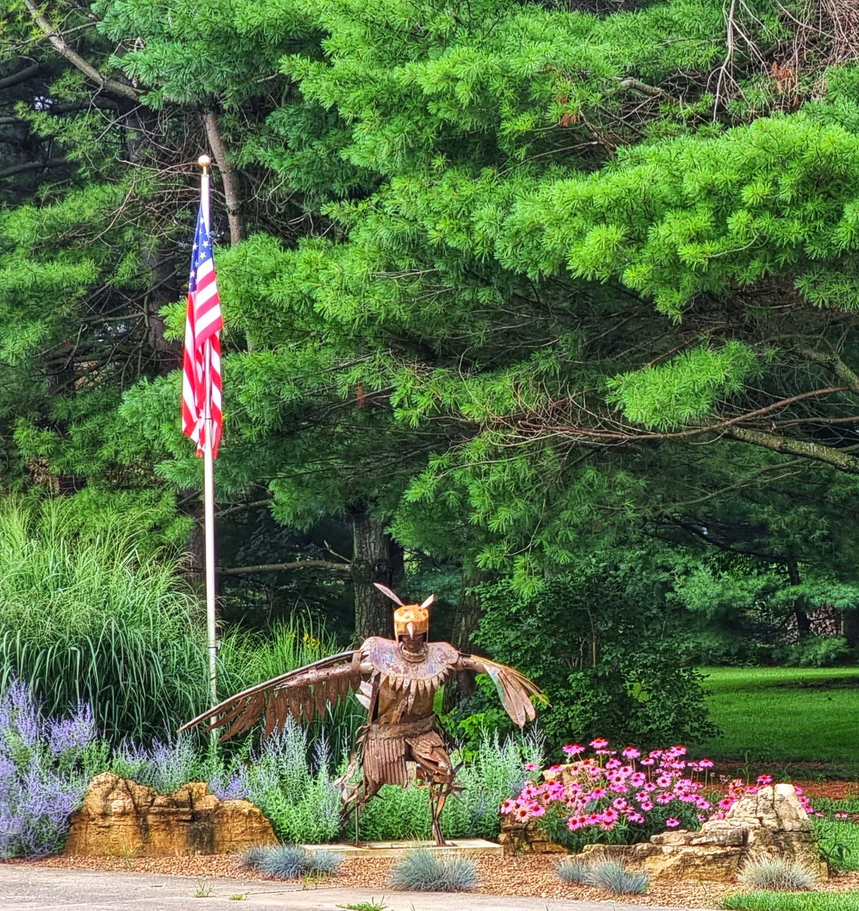 There were a couple of unexpected surprises, firstly we passed a Christmas Tree farm that appeared to be in the middle of nowhere & about 30 minutes later we spotted a house with a statue that looked like it was Birdman from Flash Gordon – needless to say we then did awful impressions of Brian Blessed’s character Prince Vultan shouting “Gordon’s Alive”, as well as singing the Queen theme tune. 15 weeks on the road has turned our brains to putty!!!