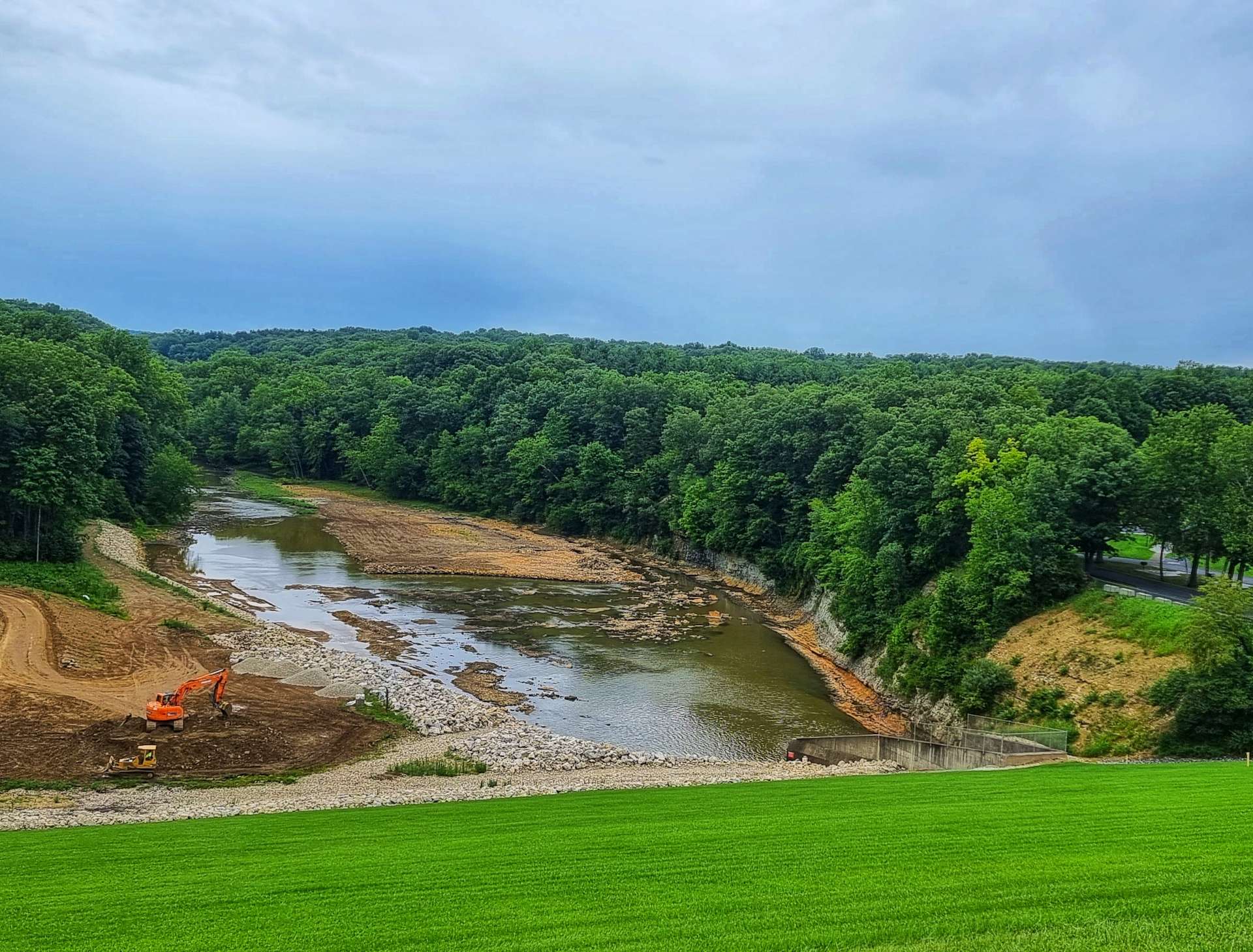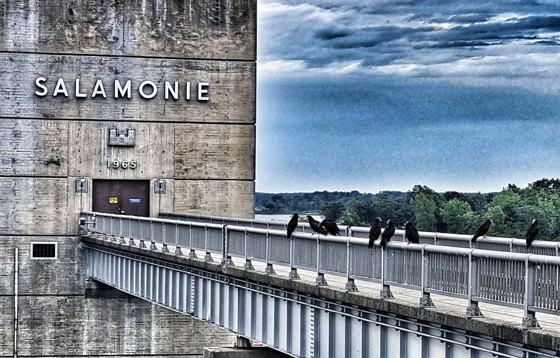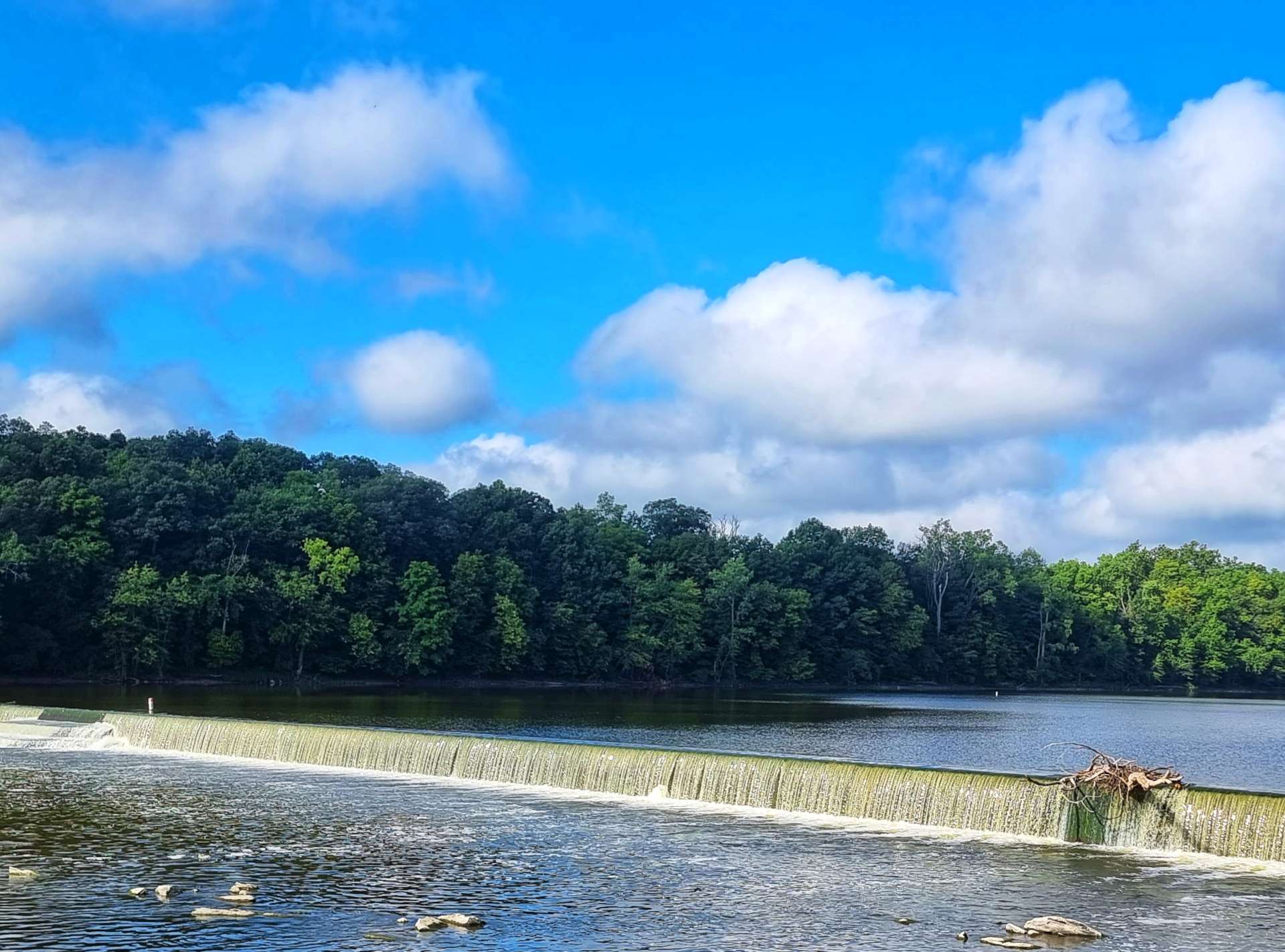 The ACA route recommended taking a side trip to visit the Dam on the way through Salamonie State Park. Fresh tarmac had been laid in the last couple of weeks & we fairly whizzed down the descents as we followed the river. The Salamonie Dam was constructed in 1966 by the US Army Corps of Engineers (you may remember that they also constructed the complex Locks & supports for St Anthony Falls in Minneapolis). The dam is 6,100 feet long & 133 feet high.