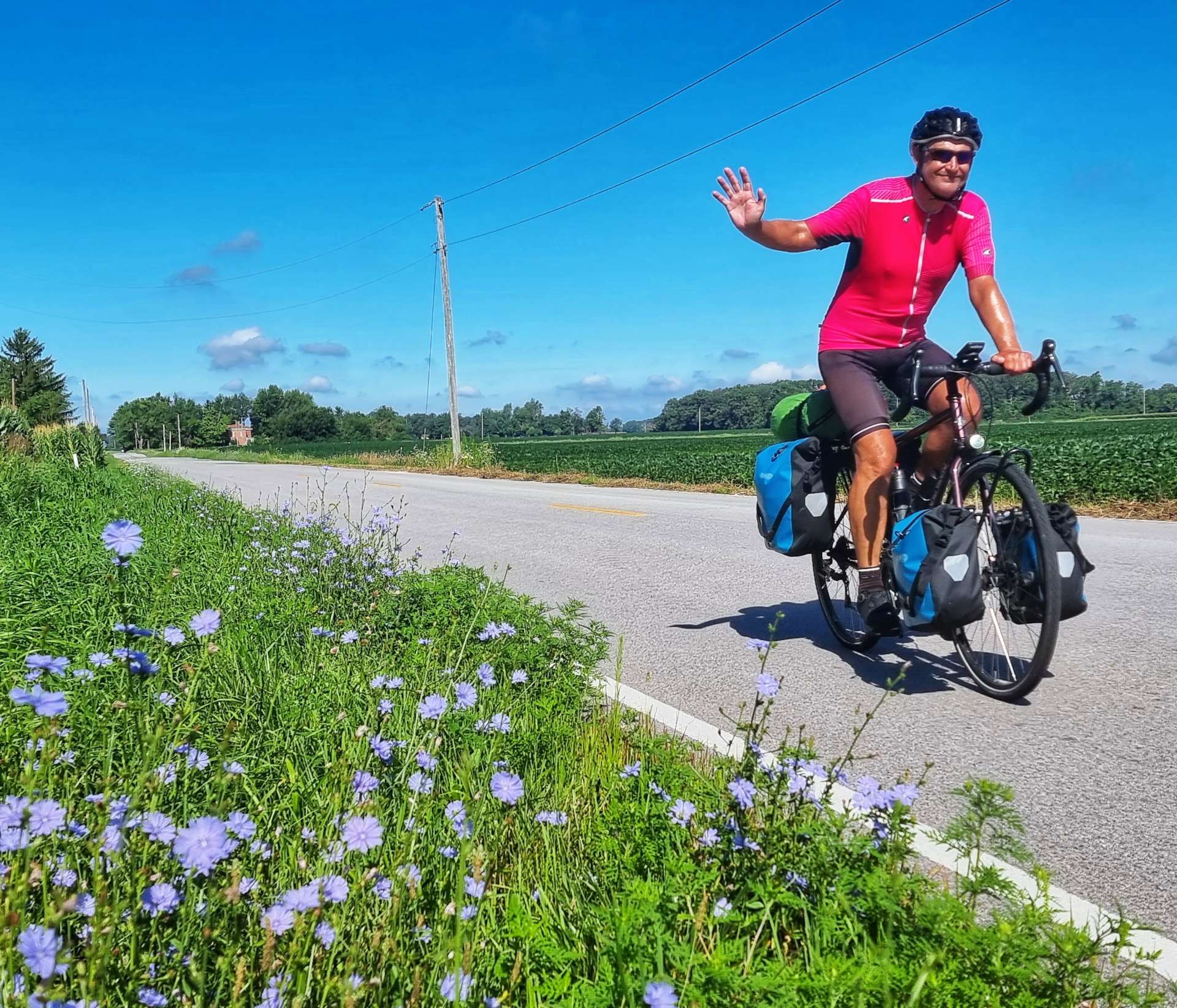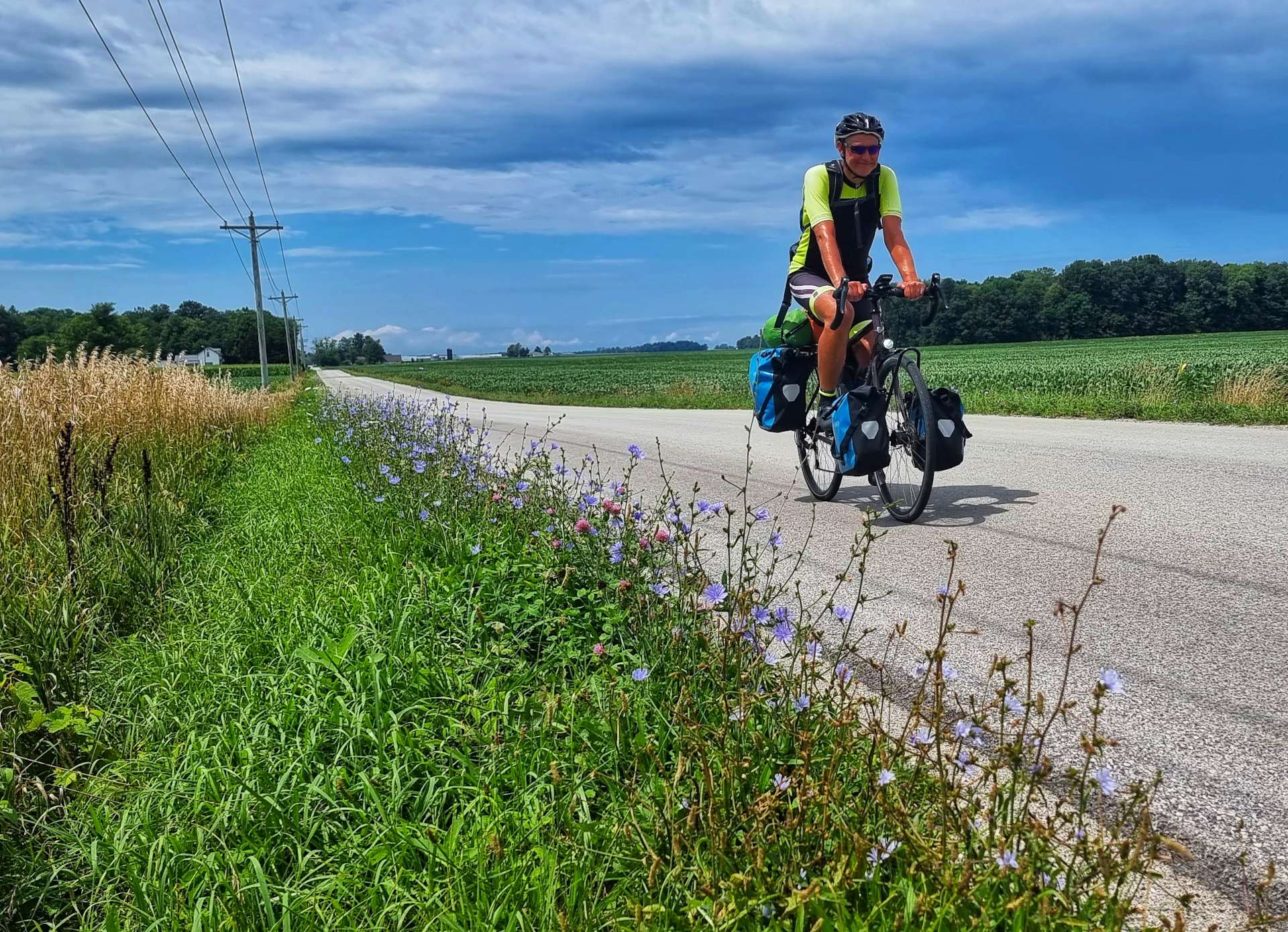 Although it was a Saturday morning, there was hardly any traffic on the road. As we continued along the side of the Maumee, the scenery around us continually switched between woodland & farmland. I’d asked Sean if he’s take an action shot for me & we managed to time it so we also captured 3 local cyclists out for their Saturday ride – they disappeared into the distance! We’ve learned to be humble & accept that with our steel bikes & touring kit we’re easy pickings for everyone else on a bike & trying to catch up or keep up only ends in tired legs & bruised egos!!!