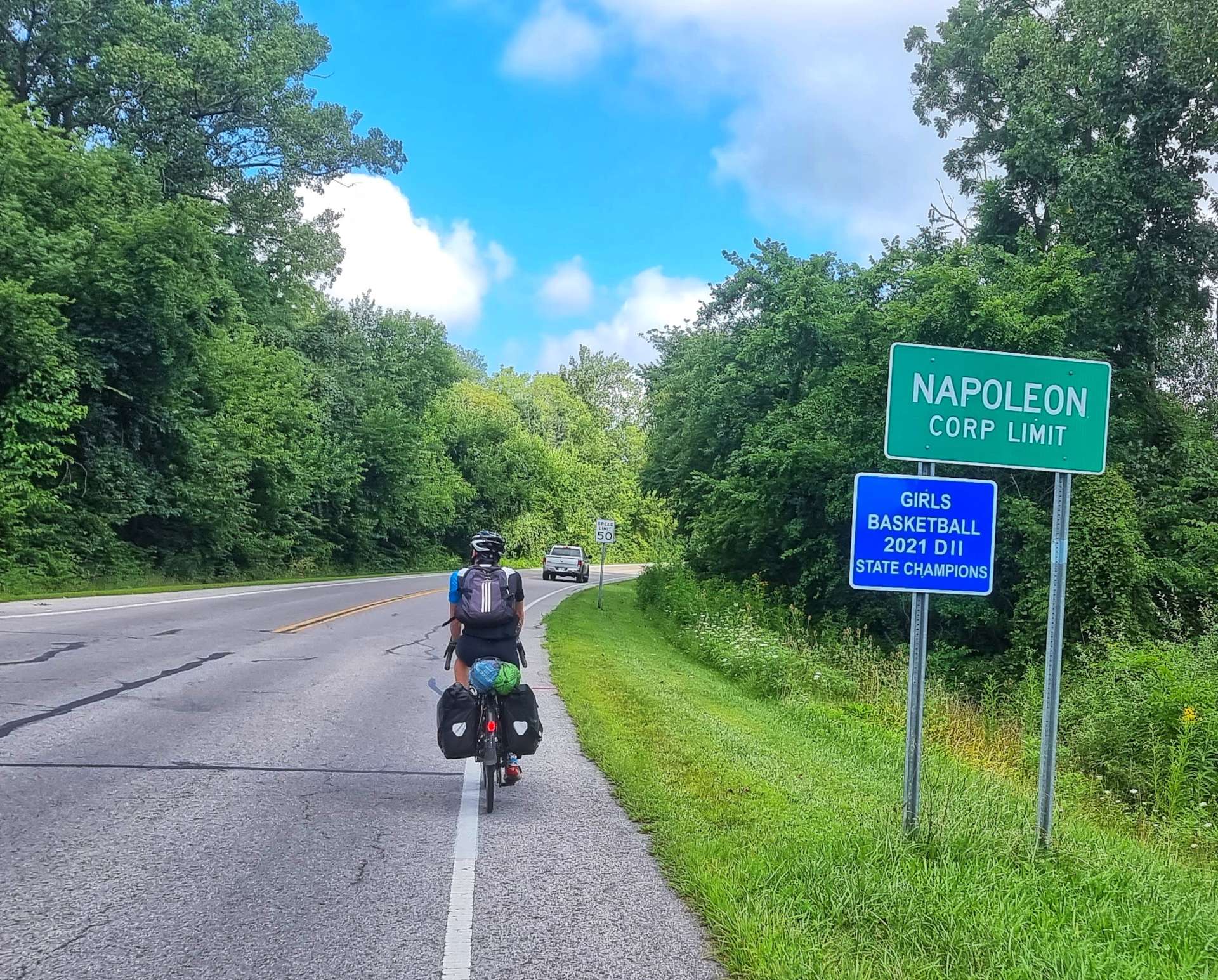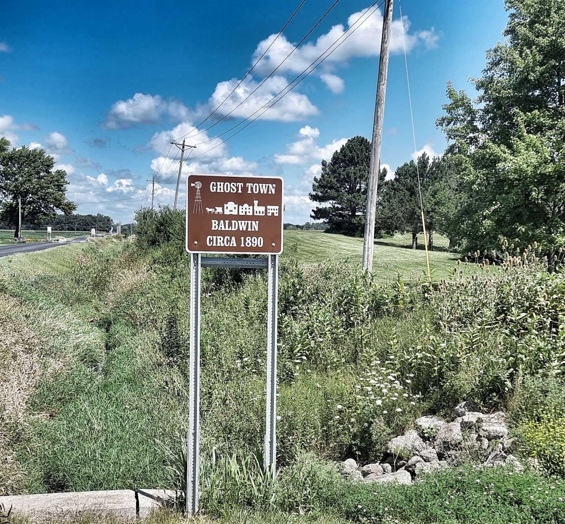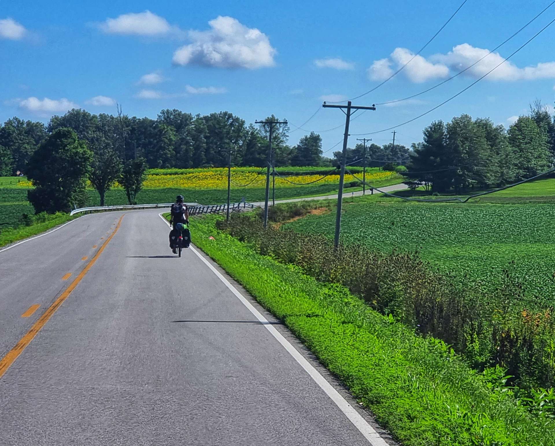 New tarmac had been laid recently & as we cycled along we could feel the road becoming more sticky, as the tar was still warm! As we neared the end of the new road, the road workers had finished for the day & were heading towards us. Baldwin is one of six ghost towns situated in Ohio, near to the Indiana border, but from later research there doesn’t appear to be much to see, so I’m glad we didn’t detour to try & find it!